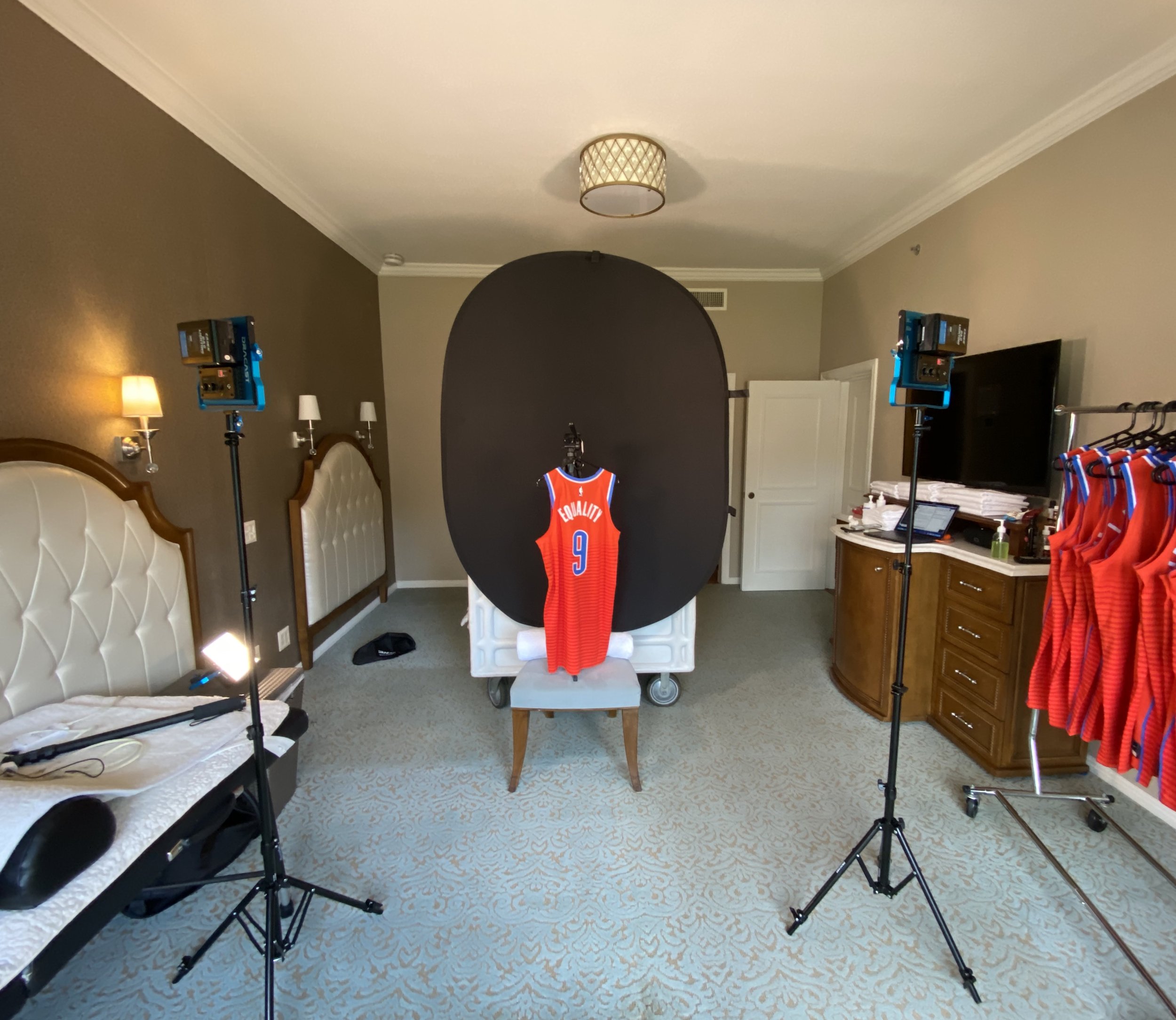Amid the unique circumstances of the NBA Bubble in Orlando in 2020, the NBA and the NBPA granted players the opportunity to convey their commitment to social justice causes by displaying messages on the back of their jerseys. As the exclusive team content creator present at the event, I orchestrated a special photoshoot capturing our players proudly wearing their chosen jersey messages. Although the space and resources available were less than ideal (see image below) we were still able to capture some unique and powerful images.